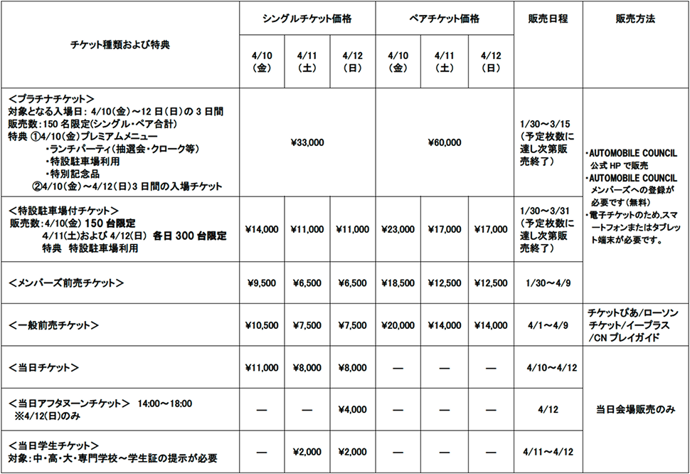 ①4月10日(金)の入場者数は、「プラチナチケット」「特設駐車場付チケット」「メンバーズ前売チケット」「一般前売チケット」「当日チケット」による合計3,000名に限定します。