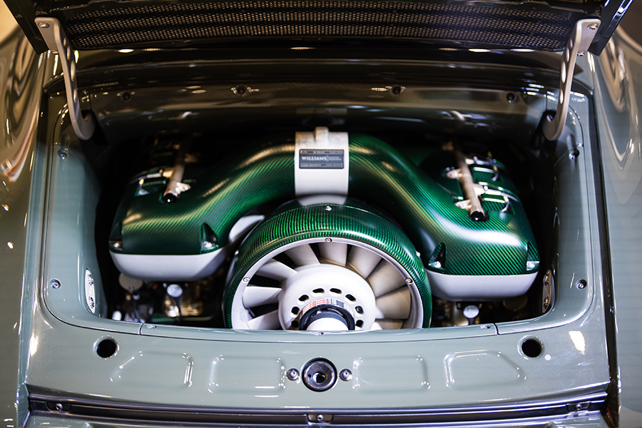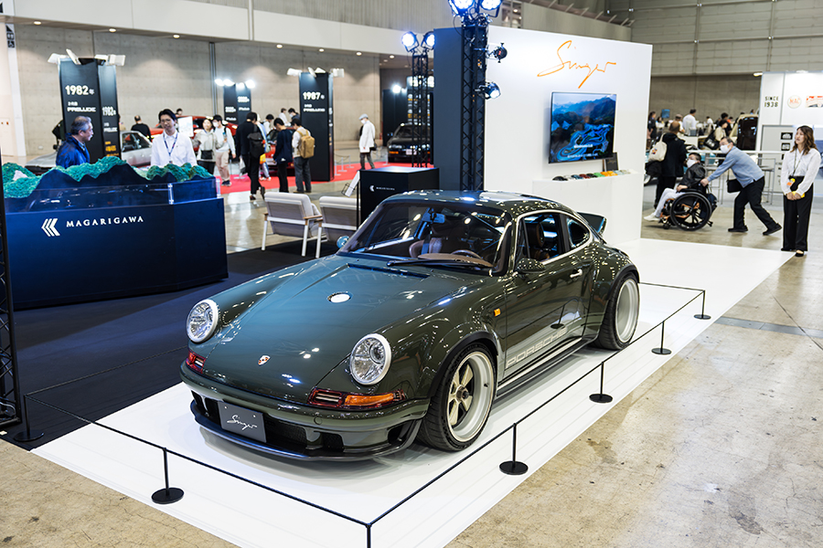 アメリカ発・ヘリテージ・ポルシェ911のレストモッドベンダー「Singer Vehicle Design(シンガー・ヴィークル・デザイン)」。元ミュージシャンのRob Dickinson氏によって創業され、Porsche 911をベースに車両を完全分解し、シャシー補強、カーボンボディ、最新のサスペンションやエンジンを組み合わせて再設計。「レストアではなく“reimagined(再想像)された911”」と表現しレストアモッドの代表例として知られている。各車両は顧客ごとにメインプログラムと仕様を決めるビスポーク製作で、車両一台一台にオーナーによって名前がつけられていく。展示された車両は“Less Green Machine-DLS Services-”。DLSは「Dynamic and Lightweighting Study」の略で、Williams F1 Teamとのコラボレーションから生まれたDOHC 4.0L空冷ユニットを搭載し、世界で最も先進的な空冷911を追求した1台だ。