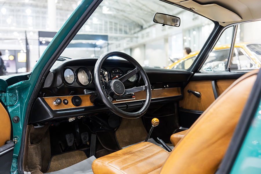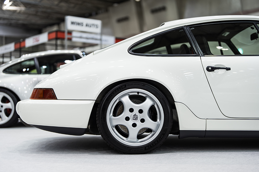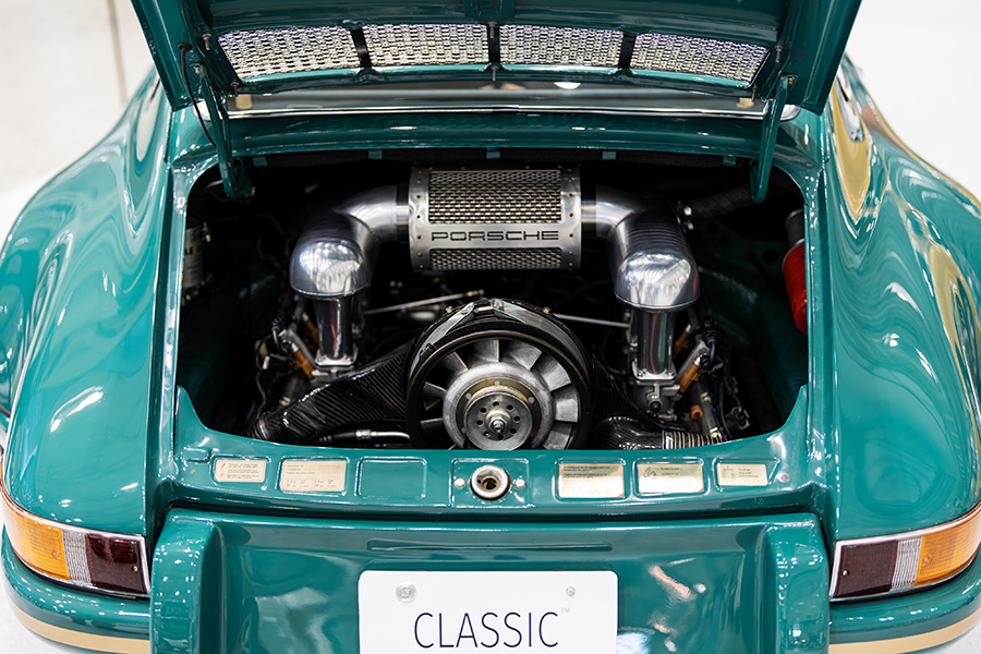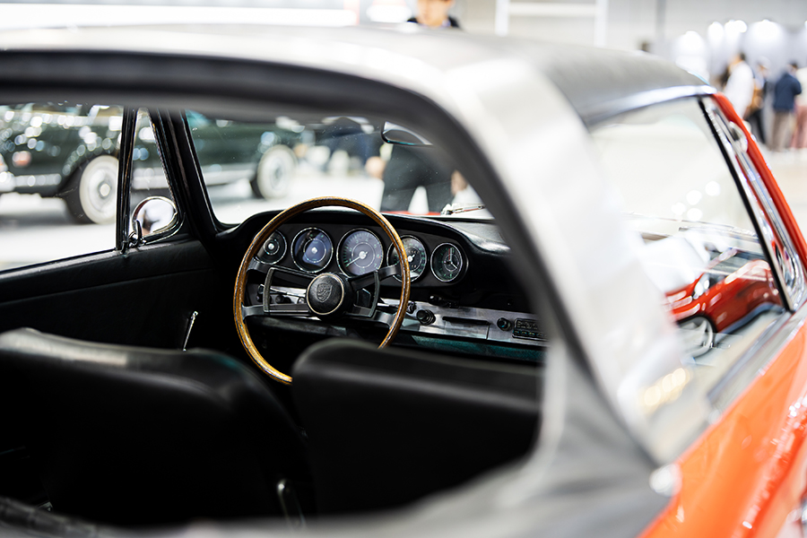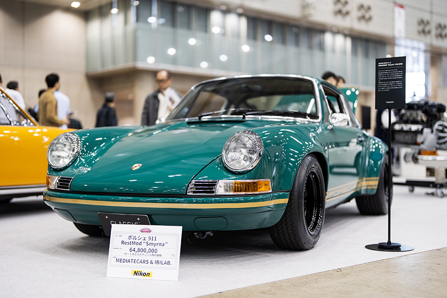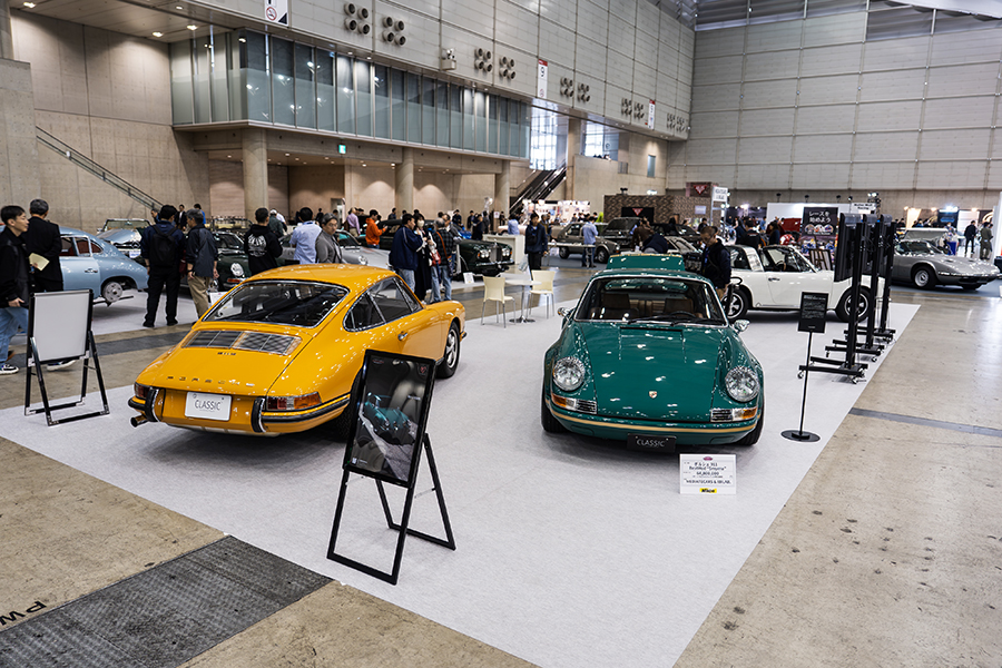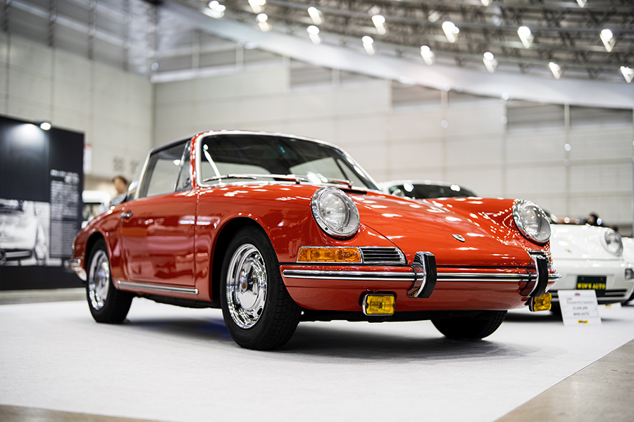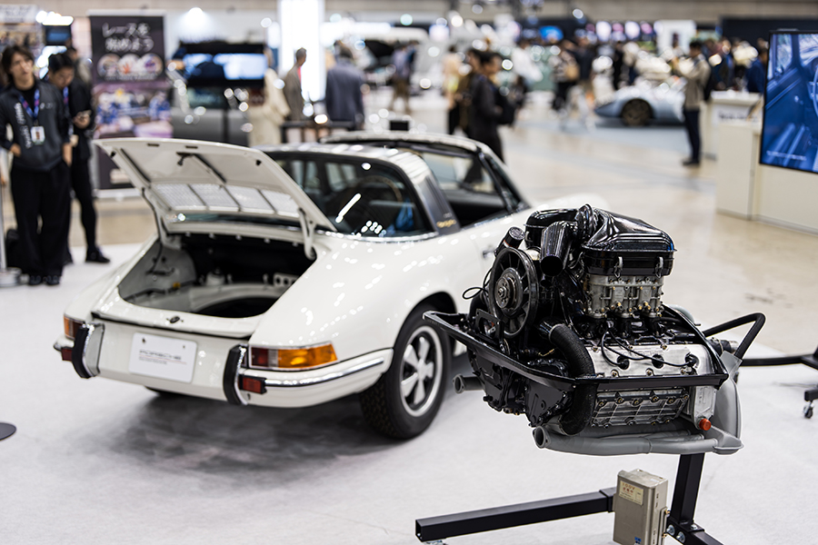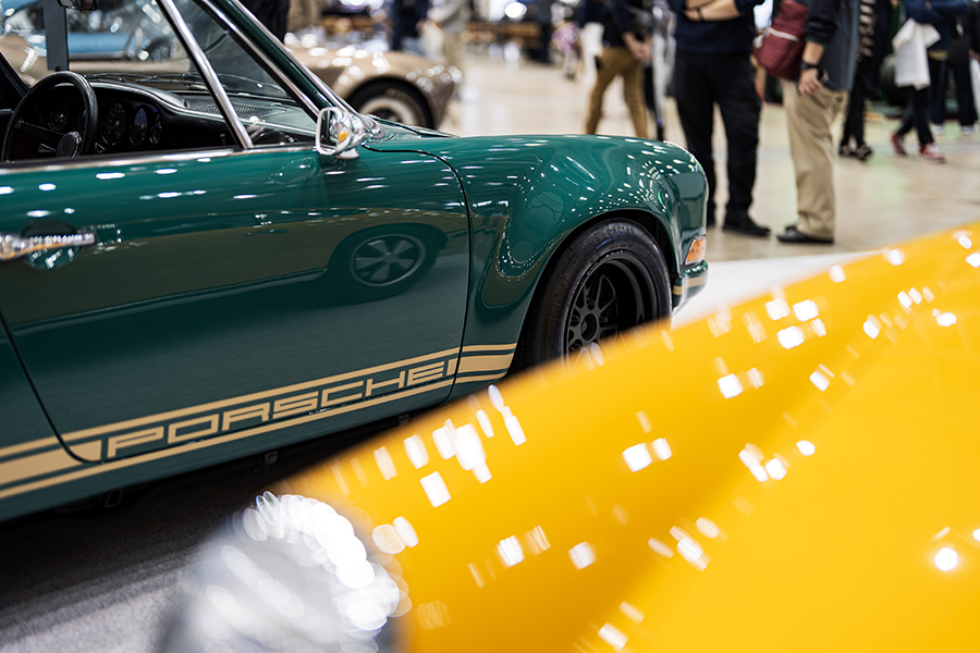 会場には厳選されたポルシェ・911を3台展示。「1972y 911 Smyrna RESTO-MOD 3.4L made by Zurlinden Gruppe」。356時代に採用されたボディカラー”Smyrna Green(スマーナグリーン)”から名付けられ、アメリカのコーチビルダー・Zurlinden Gruppeで制作されたポルシェ・レストモッドだ。964、993型を901型にレストモッドするビルダーは多いが、この個体は901型 911 T(1972y)をベース車両として採用。エンジンは930型3.2Lをベースに3.4Lにボアアップしたエンジンを搭載し、足回りも合わせて近代化が図られている。オリジナルカラーのホワイトが眩しい「1996y Porsche 911T Targa」は貴重なワンオーナーを維持していた1台。ポルシェマイスターの手でO/Hされたエンジンと共に、レストレーションを施されたボディが展示された。